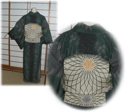 濃い緑から薄い色へ染め小紋に菊の花をイメージで染めた膨れ織九寸帯